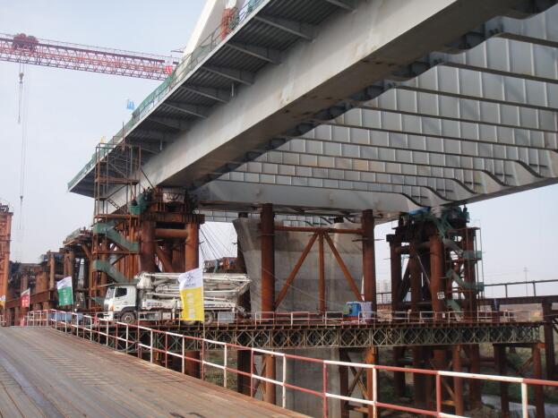 ⑦、頂推時,如果導梁桿件有變形、螺絲松動,導梁與箱梁聯(lián)結(jié)處有變形或混凝土開裂等情況發(fā)生時,應立即停止頂推,進行處理。